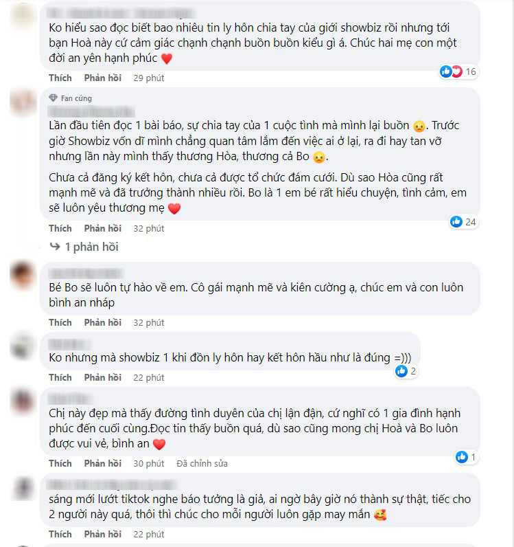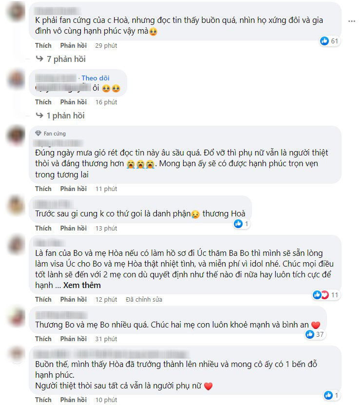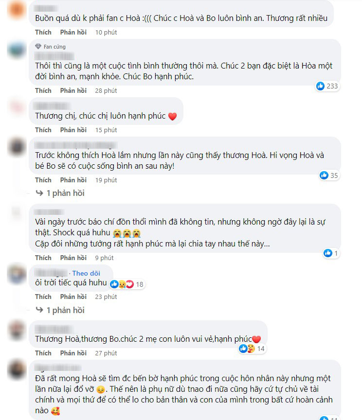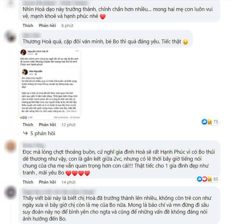 Sau lời tuyên bố của Hòa Minzy và Minh Hải, đông đảo cư dân mạng đều tỏ ra bàng hoàng và tiếc nuối. Dù đã biết đến tin đồn râm ran suốt mấy ngày qua nhưng nhiều người vẫn không thể tin bố mẹ bé Bo không còn ở bên nhau nữa. Rất nhiều lời an ủi, động viên đã được gửi tới Hòa Minzy, ai nấy đều mong cô mạnh mẽ để chăm sóc tốt cho bản thân và con trai đầu lòng.
