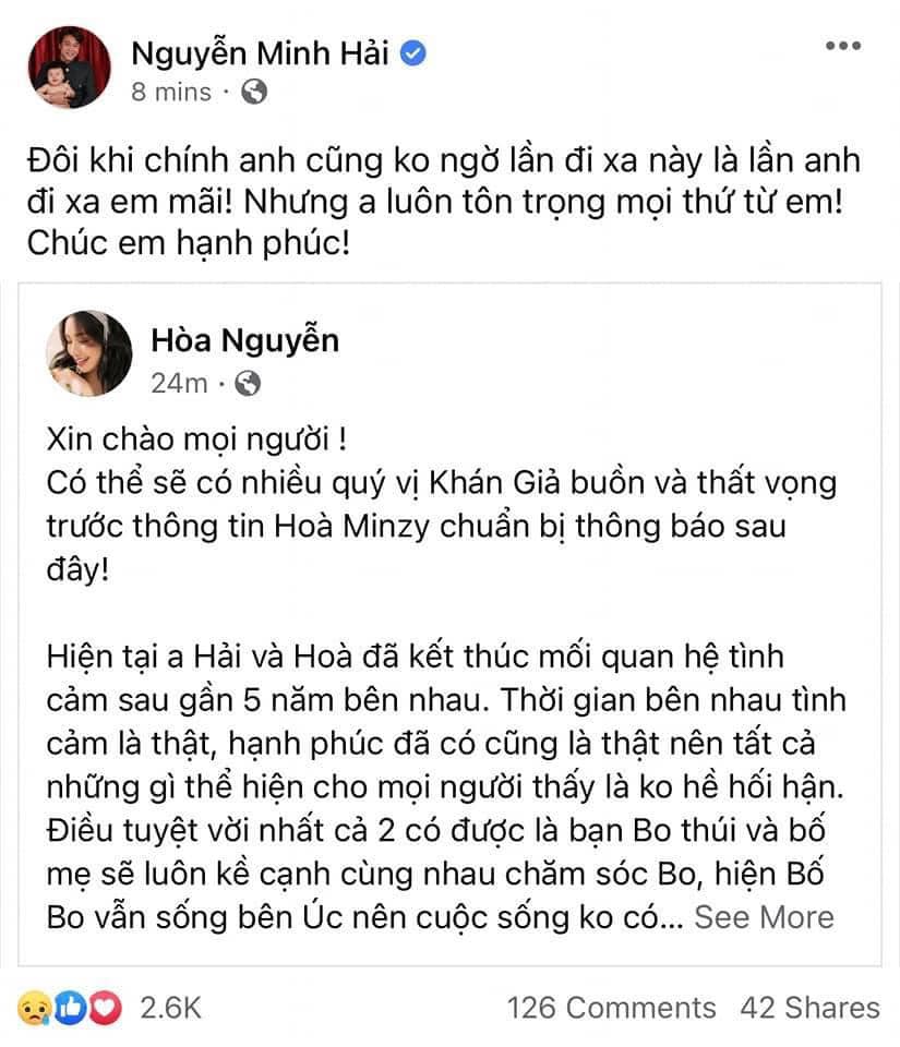 Trưa ngày 19/2, sau thời gian im lặng, Hòa Minzy chính thức lên tiếng xác nhận mối quan hệ với thiếu gia Minh Hải đã đi đến hồi kết sau gần 5 năm gắn bó. Đáng chú ý, giọng ca "Rời bỏ" cho biết cô và bố bé Bo không có bất kỳ sự ràng buộc nào về pháp lý nên không phải ra tòa làm thủ tục ly hôn, cũng không có tranh chấp về tài sản hay người thứ 3 xen vào. Nguyên nhân lớn nhất dẫn đến quyết định này là vì cả hai có định hướng khác nhau trong tương lai, không tìm được tiếng nói chung nên chia tay trong hòa bình.