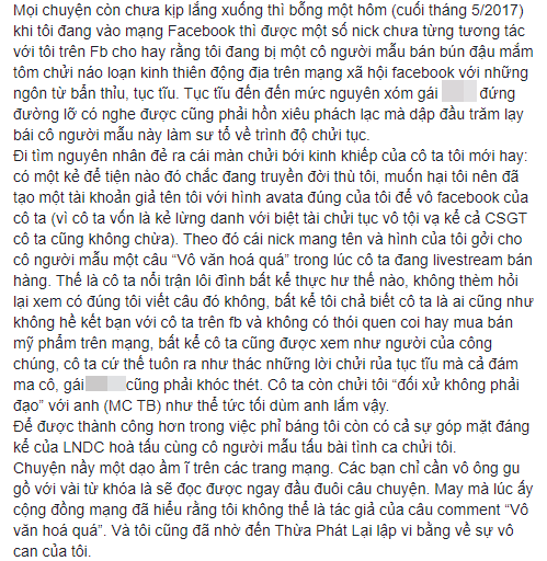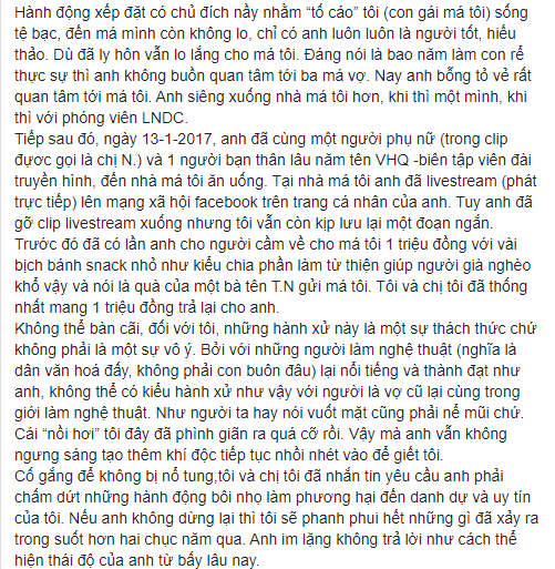 Tiếp sau đó, ngày 13-1-2017, anh đã cùng một người phụ nữ (trong clip đựơc gọi là chị N.) và 1 người bạn thân lâu năm tên VHQ - biên tập viên đài truyền hình, đến nhà má tôi ăn uống. Tại nhà má tôi anh đã livestream (phát trực tiếp) lên mạng xã hội facebook trên trang cá nhân của anh. Tuy anh đã gỡ clip livestream xuống nhưng tôi vẫn còn kịp lưu lại một đoạn ngắn.