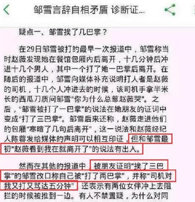 Ngày trước, Triệu Vy và một người phụ nữ tên Trâu Tuyết cùng mở quán bar, nhưng do việc quản lý không tốt nên quán bar này đã đóng cửa, bản thân Trâu Tuyết cũng biến mất tăm luôn. Sau đó vì scandal trang phục mà Triệu Vy bị tẩy chay, cô cho rằng Trâu Tuyết cố ý hãm hại mình nên đã cho tài xế tát Trâu Tuyết đến mức nhập viện. Trâu Tuyết đã đứng ra tố cáo Triệu Vy về chuyện này nhưng nữ diễn viên sinh năm 1976 cố gắng trốn tránh mọi trách nhiệm.