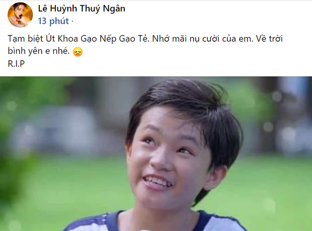 Trên trang cá nhân, Thúy Ngân chia sẻ khoảnh khắc của Bảo Bảo trong phim kèm theo dòng trạng thái đầy xúc động: "Tạm biệt Út Khoa Gạo Nếp Gạo Tẻ. Nhớ mãi nụ cười của em. Về trời bình yên em nhé".