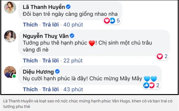 Trong khung hình, Vân Hugo cười tươi roi rói, ngả đầu vào vai bạn trai đại gia. "Người ấy" của Vân Hugo cũng không giấu được hạnh phúc, vòng tay ôm cô nàng. Khung hình ngọt ngào của bộ đôi làm ai nấy đều phải xuýt xoa, ghen tị. Đặc biệt, Vân Hugo và bạn trai càng nhìn càng thấy có tướng phu thê. Đến Lã Thanh Huyền cũng phải khẳng định: "Đôi bạn trẻ ngày càng giống nhau", hàng loạt các sao Việt khác như Thuỵ Vân, Diệu Hương, Thuỳ Anh đều gửi nhiều lời chúc phúc đến Vân Hugo. Trải qua 1 lần đổ vỡ hôn nhân, người hâm mộ cũng không khỏi vui mừng vì nữ MC gốc Hà Thành cuối cùng đã tìm được bến đỗ ấm êm cho mình.