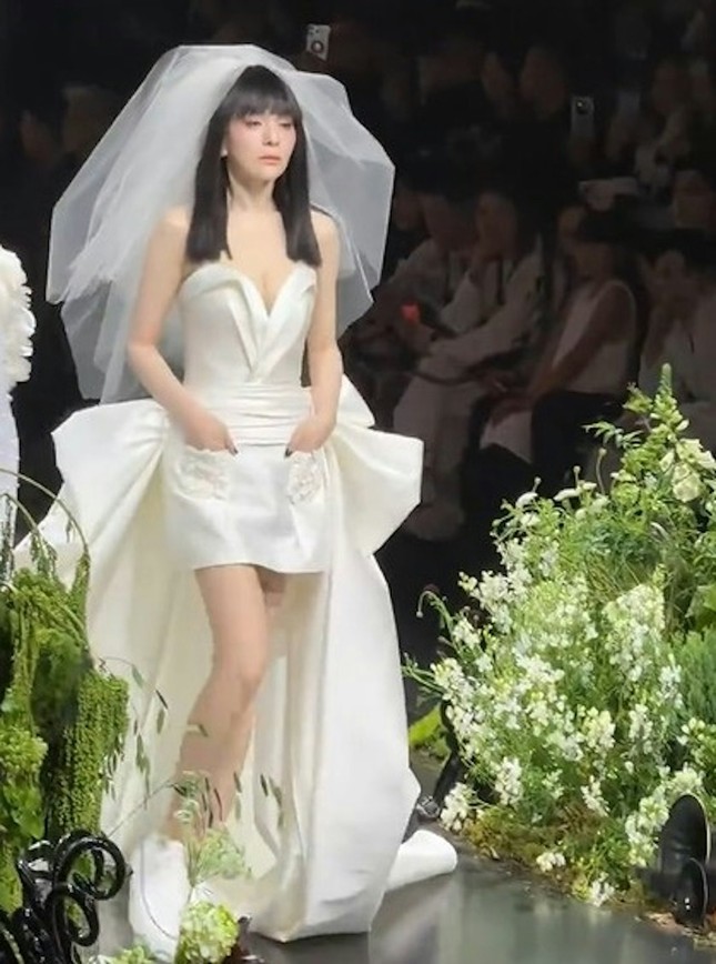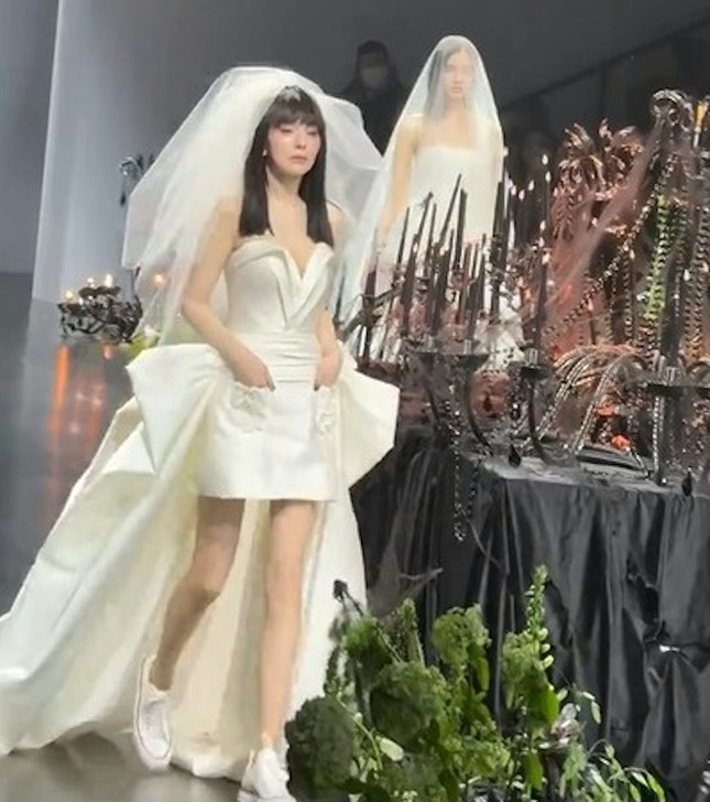 Trong video được chia sẻ trên mạng, Vương Lâm diện váy cưới sải bước trên sàn diễn thời trang. Bộ cánh được thiết kế giống với váy cúp ngực liền thân dáng ngắn, kèm theo phần đuôi dài, kết hợp khăn voan đội đầu và giày thể thao trắng, mang đến hình ảnh cô dâu phá cách, năng động.