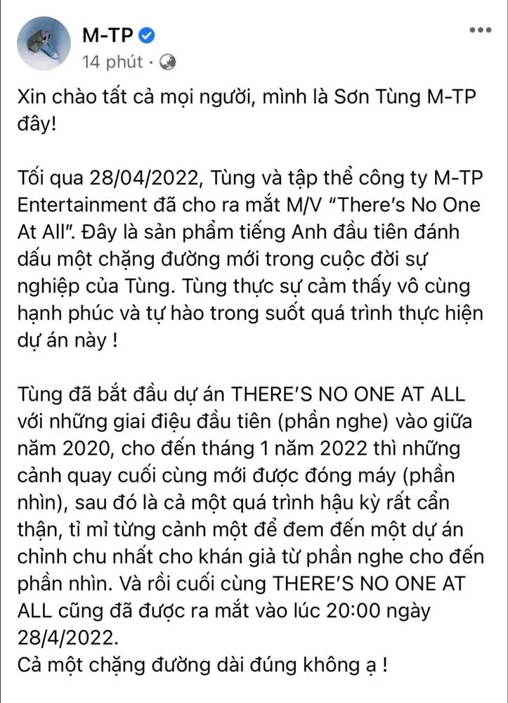Tối 29/4, Sơn Tùng M-TP đã đăng đàn xin lỗi và chủ động dừng phát hành MV There's No One At All sau khi bị chỉ trích dữ dội. Vì có cảnh tự sát trong MV nên Cục Nghệ thuật Biểu diễn đề nghị dừng lưu hành sản phẩm này.