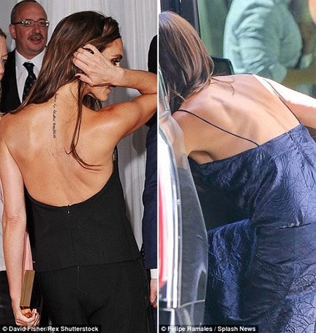 Nhà thiết kế Victoria Beckham khiến người hâm mộ ngỡ ngàng khi cô xuất hiện tại tuần lễ thời trang New York với phần gáy gần như không còn dấu vết của hình xăm bằng tiếng Do Thái quen thuộc. Hình xăm đó có ý nghĩa "Tôi thuộc về người yêu tôi và người yêu tôi thuộc về tôi", là một lời nhắn gửi yêu thương dành cho người chồng của Vic, cựu cầu thủ nổi tiếng David Beckham.