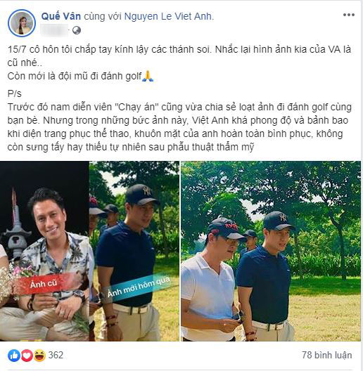 Nguyên văn dòng trạng thái của Quế Vân: "15/7 cô hồn tôi chắp tay kính lậy các thánh soi. Nhắc lại hình ảnh kia của Việt Anh là cũ nhé. Còn mới là đội mũ đi đánh golf. Trước đó nam diễn viên "Chạy án" cũng vừa chia sẻ loạt ảnh đi đánh golf cùng bạn bè. Nhưng trong những bức ảnh này, Việt Anh khá phong độ và bảnh bao khi diện trang phục thể thao, khuôn mặt của anh hoàn toàn bình phục, không còn sưng tấy hay thiếu tự nhiên sau phẫu thuật thẩm mỹ".