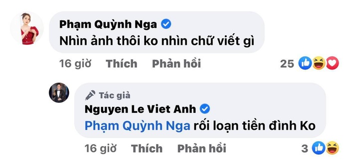 Dòng chia sẻ trên của nam diễn viên khiến nhiều người tâm đắc. Dưới bài viết, Quỳnh Nga để lại bình luận: "Nhìn ảnh thôi không nhìn chữ viết gì". Việt Anh hài hước trả lời: "Rối loạn tiền đình không". Cùng lúc, Hương Trần - vợ cũ Việt Anh cũng để lại bình luận trêu đùa: "Mặt xinh gái". Nam diễn viên không ngại trêu lại vợ cũ: "Ok Hương đẹp trai".
