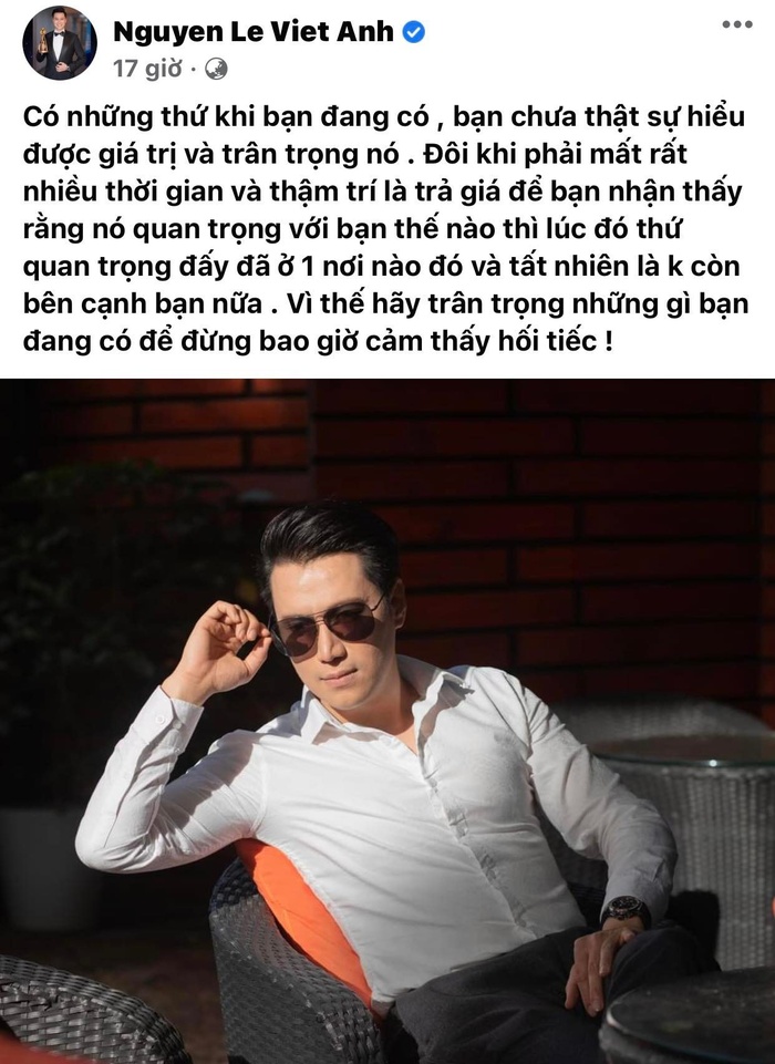 Nam diễn viên viết: "Có những thứ khi bạn đang có, bạn chưa thật sự hiểu được giá trị và trân trọng nó. Đôi khi phải mất rất nhiều thời gian và thậm chí là trả giá để bạn nhận thấy rằng nó quan trọng với bạn thế nào thì lúc đó thứ quan trọng đấy đã ở 1 nơi nào đó và tất nhiên là không còn bên cạnh bạn nữa. Vì thế hãy trân trọng những gì bạn đang có để đừng bao giờ cảm thấy hối tiếc".