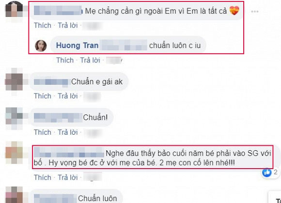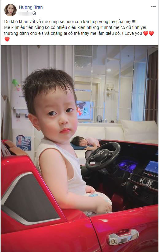 Ngay sau dòng trạng thái của Việt Anh, Hương Trần đã nhanh chóng có động thái khẳng định quyền nuôi con là thuộc về mình: "Dù khó khăn, vất vả, mẹ cũng sẽ nuôi con lớn trong vòng tay của mẹ. Mẹ không nhiều tiền và cũng không có điều kiện, nhưng ít nhất mẹ có đủ tình yêu thương dành cho em. Và chẳng ai có thể thay mẹ làm điều đó. Love you".