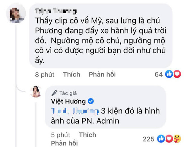 Cho đến mới đây, Việt Hương đã lên tiếng hé lộ sự thật bên trong những kiện hàng đó. Cụ thể, khi một khán giả bình luận: "Thấy clip cô về Mỹ, sau lưng là chú Phương đang đẩy xe hành lý quá trời đồ. Ngưỡng mộ cô chú, ngưỡng mộ cô vì có được người bạn đời như chú ấy", nữ danh hài đã thông qua admin fanpage trả lời rằng: "3 kiện đó là hình ảnh của Phi Nhung".