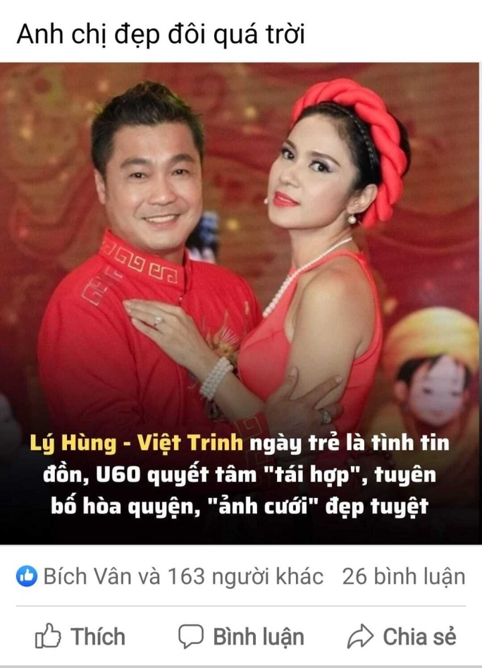Cụ thể, diễn viên Việt Trinh cho biết, mạng xã hội lan truyền tấm ảnh chị và diễn viên Lý Hùng chụp cùng nhau trong một chương trình cách đây vài năm. Không chỉ vậy, mọi người khẳng định, đó là ảnh cưới của cặp đôi.
