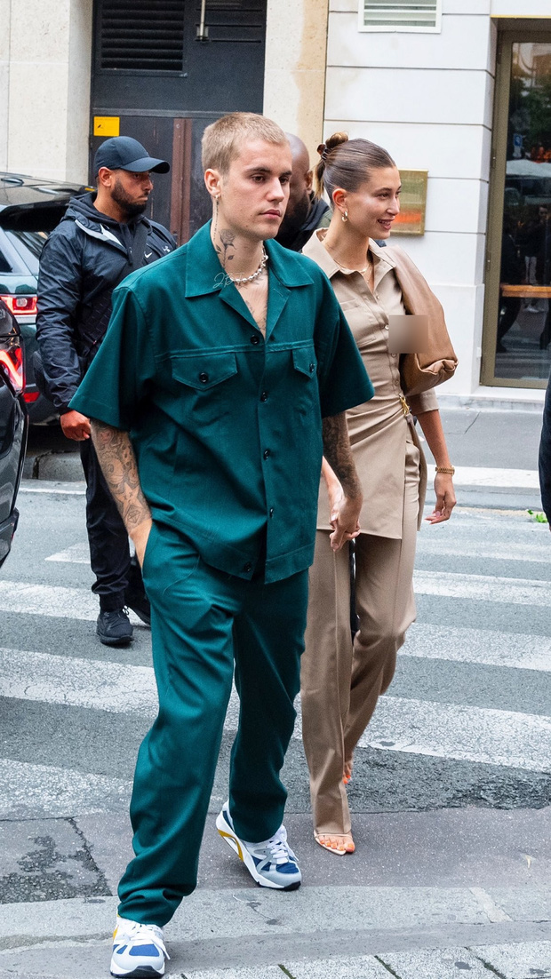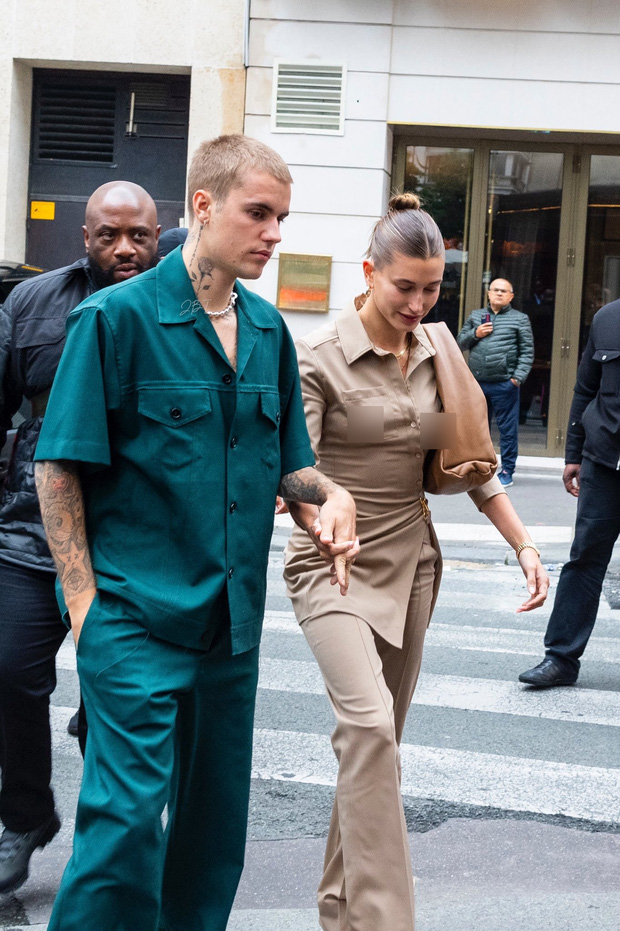 Trong ngày thứ 3 đến thăm Paris, Justin tiếp tục gây xôn xao cả khu phố khi làm nhiệm vụ hộ tống bà xã mỗi khi ra ngoài. Sau khi bị chỉ trích vì màn hở bạo trước mặt Tổng thống Pháp, nàng mẫu Hailey Baldwin tiếp tục gây chú ý khi "thả rông" táo bạo dù đang diện trang phục khá nghiêm túc. Nhìn sang ông chồng Justin, netizen lại giật mình hết hồn vì tưởng... anh bảo vệ nào đang dẫn nàng minh tinh Hailey. Người hâm mộ cũng phải bất lực với trường hợp này, từ trước tới giờ 2 vợ chồng Bieber đã phối đồ hợp nhau bao giờ đâu. Lần này, cặp đôi trẻ một lần nữa trở thành tâm điểm vì vợ thì "thả rông", chồng lại ăn mặc không khác gì bảo vệ.