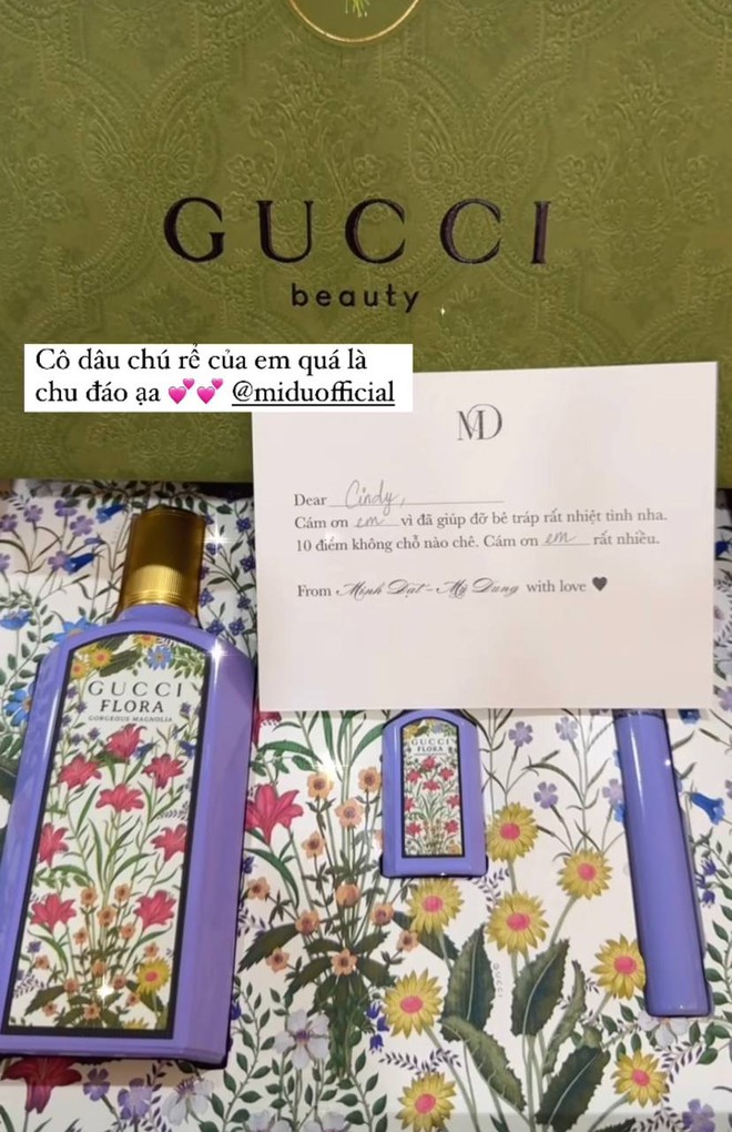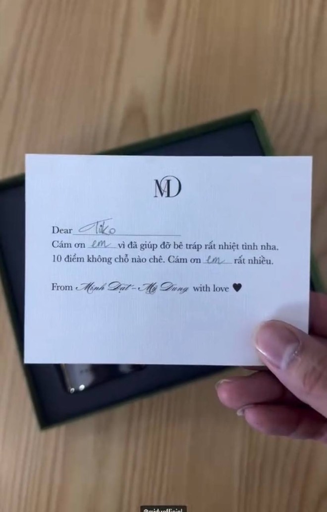 Đáng nói nhất, sự chu đáo và chân thành của cặp đôi còn thể hiện qua việc viết thư đính kèm. Tiko Tiến Công tiết lộ nội dung thư cảm ơn của Midu: "Cảm ơn em vì đã giúp đỡ bê tráp rất nhiệt tình nha, 10 điểm không có chỗ nào chê. Cảm ơn em rất nhiều. From Minh Đạt - Mỹ Dung with love".