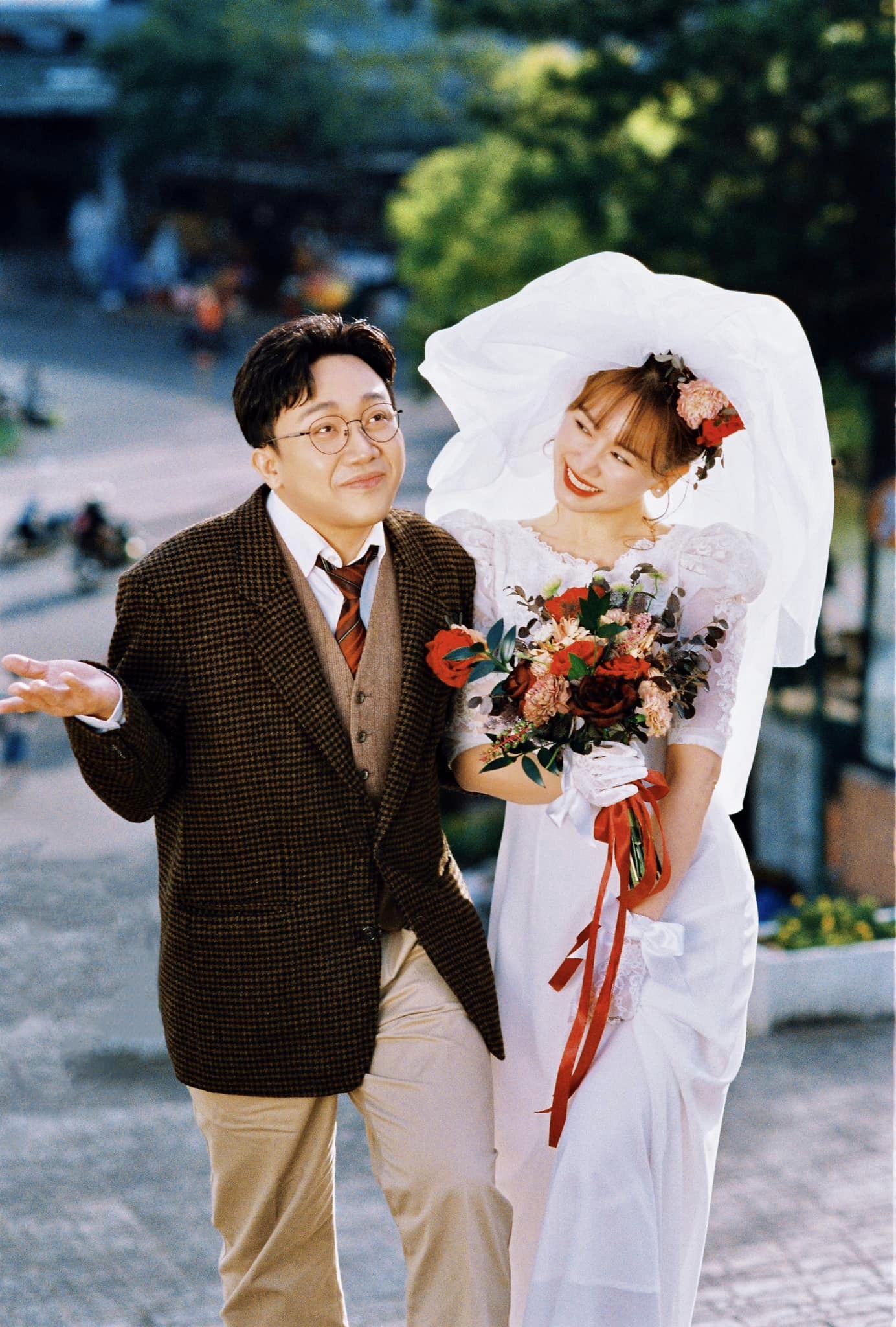 Trong bộ ảnh đặc biệt lần này, Hari Won diện một chiếc váy cưới ren tay bồng cổ điển chuẩn phong cách thập niên 90. Về phần Trấn Thành, nam MC đình đám mặc một bộ vest kẻ với tông màu nâu be cổ điển.
