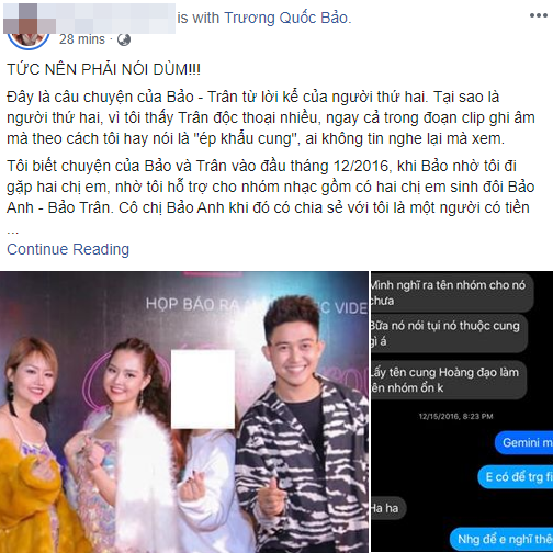 Theo đó, tài khoản này đã đăng tải một bài viết dài trên trang cá nhân phân trần về những điều trong mối quan hệ giữa Bảo Trân và Quốc Bảo. "Đây là câu chuyện của Bảo - Trân từ lời kể của người thứ hai. Tại sao là người thứ hai, vì tôi thấy Trân độc thoại nhiều, ngay cả trong đoạn clip ghi âm mà theo cách tôi hay nói là 'ép khẩu cung', ai không tin nghe lại mà xem", người này viết.