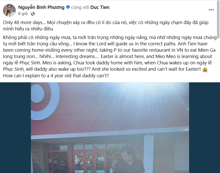 Tôi tin rằng Chúa sẽ dẫn lối chúng ta đi trên con đường đúng đắn. Anh Tiến đã về thăm nhà cách ngày, đưa bé P đến nhà hàng yêu thích của chúng tôi ở Việt Nam để ăn miến gà lòng trứng non… Những giấc mơ thật kỳ lạ…