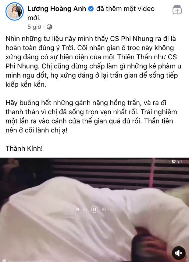 Theo đó, vào ngày 7/10, Lương Hoàng Anh đăng tải clip cố ca sĩ Phi Nhung chơi đùa cùng con nuôi lúc sinh thời, đi kèm với dòng trạng thái: "Nhìn những tư liệu này mình thấy ca sĩ Phi Nhung ra đi là hoàn toàn đúng ý trời. Cõi nhân gian ô trọc này không xứng đáng có sự hiện diện của một thiên thần như ca sĩ Phi Nhung. Chị cũng đừng chấp làm gì những kẻ phàm u minh ngu dốt, họ xứng đáng ở lại trần gian để sống tiếp kiếp kền kền. Hãy buông hết những gánh nặng hồng trần, và ra đi thanh thản vì chị đã sống trọn vẹn nhất rồi. Trải nghiệm một lần ra vào cánh cửa thế gian quá đủ rồi. Thần tiên nên ở cõi lành chị ạ! Thành Kính!".