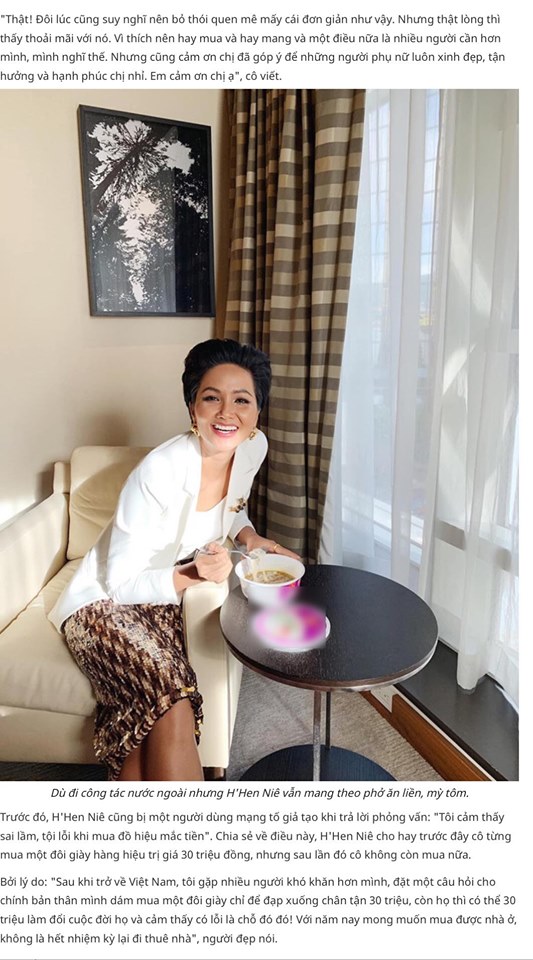 Giữa chốn showbiz xa hoa và phù phiếm, H'Hen Niê vẫn đủ tỉnh táo để biết mình là ai, để không chạy theo bất cứ hình mẫu nào, để không bị cám dỗ bởi ánh hào quang của một người nổi tiếng. Không sang chảnh, không hàng hiệu, H'Hen Niê vẫn nhớ mình xuất thân từ đâu, vẫn giữ những thói quen từ thời khó khăn đó, từ cách tiết kiệm khi mua đồ đạc đến sự giản dị trong suy nghĩ.
