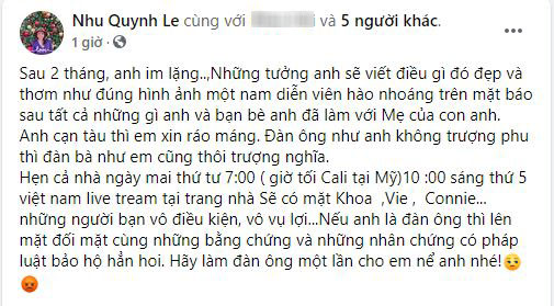 Hẹn cả nhà ngày mai thứ tư 7:00 (giờ tối Cali tại Mỹ), 10:00 sáng thứ 5 Việt Nam livestream tại trang nhà. Sẽ có mặt Khoa và Vie và Connie những người bạn vô điều kiện, vô vụ lợi. Nếu anh là đàn ông thì lên mặt đối mặt cùng những bằng chứng và những nhân chứng có pháp luật bảo hộ hẳn hoi. Hãy làm đàn ông một lần cho em nể anh nhé!".