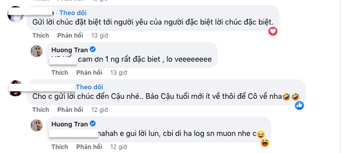 Bên dưới loạt ảnh của Hương Trần, bạn bè, người thân của cô thích thú bình luận: "Và con tim đã vui trở lại", "Gửi lời chúc đặc biệt tới người yêu của người đặc biệt lời chúc đặc biệt", "Cho chị gửi lời chúc đến cậu nhé. Bảo cậu tuổi mới ít về thôi để cô về nha"...
