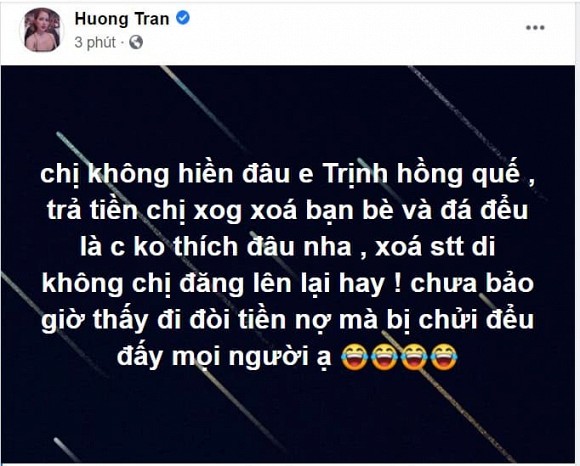 Sự việc trở nên căng thẳng hơn khiến Hương Trần phải đăng bài "bóc phốt" là vì cuộc nhắn tin mới đây của cô và Hồng Quế. Hương Trần viết: "Lần này là đỉnh điểm mình nhắn tin thì bạn ấy cười haha "ok chị ơi". Khoảng 10 phút sau xóa bạn bè và lên Facebook viết. Thế là trả nợ xong là không chơi với nhau nữa nên xóa, còn nợ trước chưa trả thì vẫn là bạn bè! Xin nhắc lại bạn ấy chính thức không nợ đồng nào cách đây mấy phút thôi ạ".