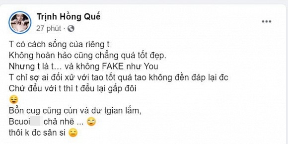 Về phía Hồng Quế, sau khi bỏ bạn bè với Hương Trần, nữ người mẫu đăng trạng thái: "Tôi có cách sống của riêng tôi, không hoàn hảo cũng chẳng quá tốt đẹp. Nhưng tôi không sống giả như bạn, tôi chỉ sợ ai đối xử với tôi tốt quá tôi không đền đáp lại được. Chứ đểu với tôi thì tôi đểu lại gấp đôi".
