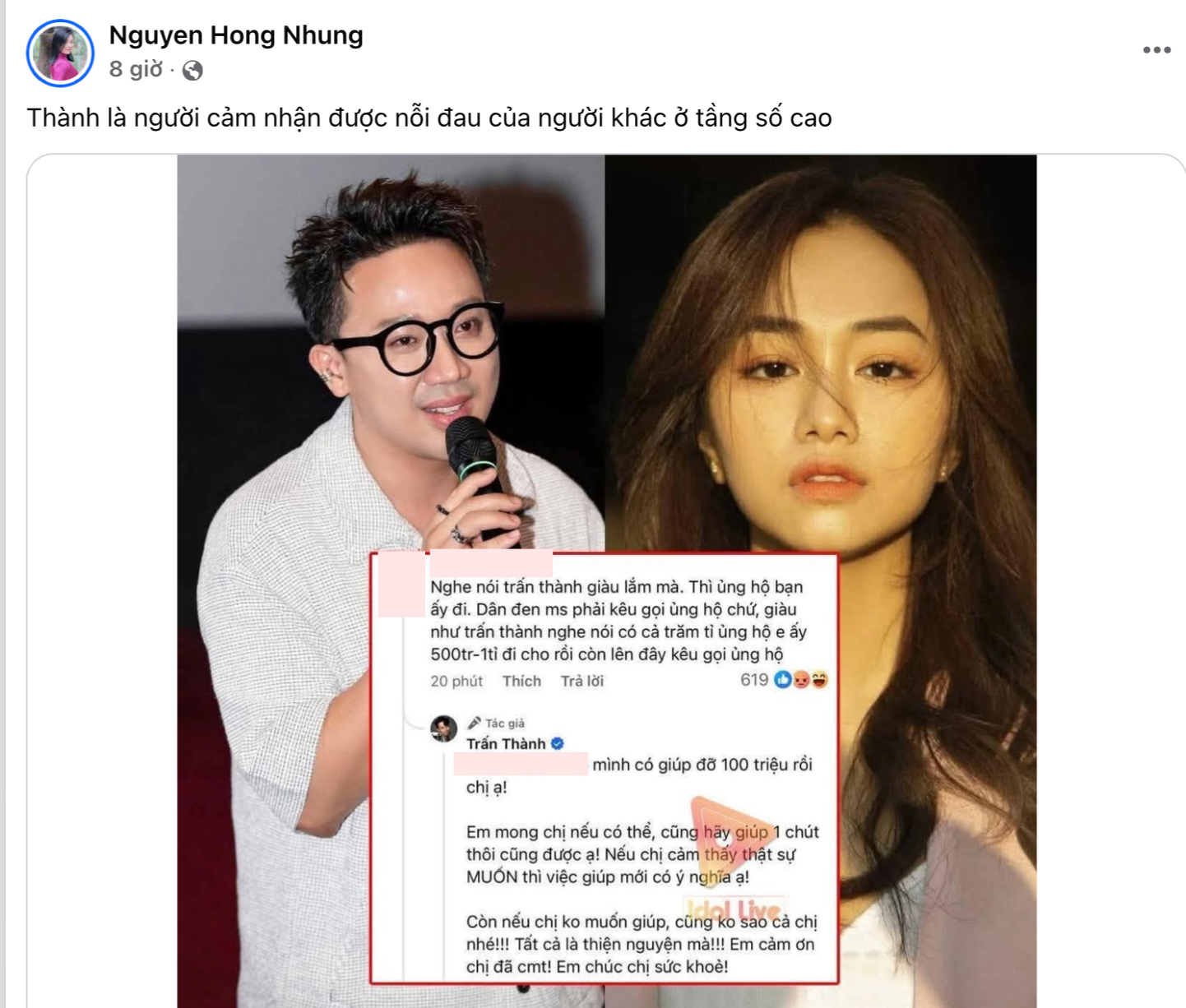 Sau nhiều năm hoạt động nghệ thuật, biến hoá với đa dạng vai trò, Trấn Thành trở thành một trong những ngôi sao lớn, quyền lực trong showbiz Việt. Chính sự nổi tiếng ngày càng lớn này đã nhiều lần khiến Trấn Thành dính vào những ồn ào không đáng có. Như mới đây nhất, việc anh hỗ trợ 100 triệu đồng, sau đó đứng ra kêu gọi quyên góp cho diễn viên Ngân Hoà - sao nữ đang điều trị suy thận giai đoạn cuối cũng vướng tranh cãi. Người ta nhìn nhận việc Trấn Thành ra tay lan toả thông tin, giúp đỡ người đang gặp biến cố theo hướng tiêu cực mà không quan tâm đến ý nghĩa thật sự của việc thiện nguyện, "lá lành đùm lá rách".