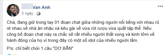 Cụ thể, Vân Anh viết: "Đang giữ trong tay một đoạn chat giữa những người nổi tiếng với nhau, rủ rê nhau về nhà ăn nhậu và kêu gái về vừa rót rượu vừa qu** tập thể. Nếu công bố đoạn chat này ra chắc sẽ rất nhiều người thất vọng và kinh tởm về hành động của họ, vì trong đây có một số idol của nhiều người lắm... Chỉ biết chửi một câu dơ bẩn".