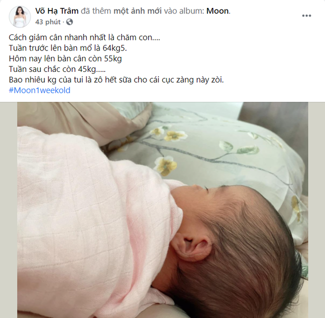 Nữ ca sĩ còn tiết lộ cô đã giảm cân cực nhanh chỉ trong vòng 1 tuần sau sinh. Cụ thể, cô đã giảm từ 64,5kg xuống còn 55kg và lý do xuống cân là bận chăm con. Võ Hạ Trâm dự đoán với tình hình xuống cân như thế này thì có thể tuần sau cô sẽ chỉ còn 45kg.