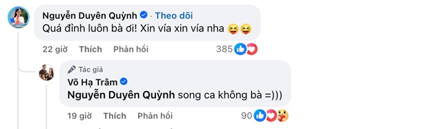 Ngay lập tức, Duyên Quỳnh cũng để lại bình luận: “Quá đỉnh luôn bà ơi! Xin vía xin vía nha”. Võ Hạ Trâm liền rủ Duyên Quỳnh hát song ca bài hát này. Được biết, hai cô nàng đã có ý định này từ trước đại lễ nhưng vì bận rộn nên chưa thể thực hiện.