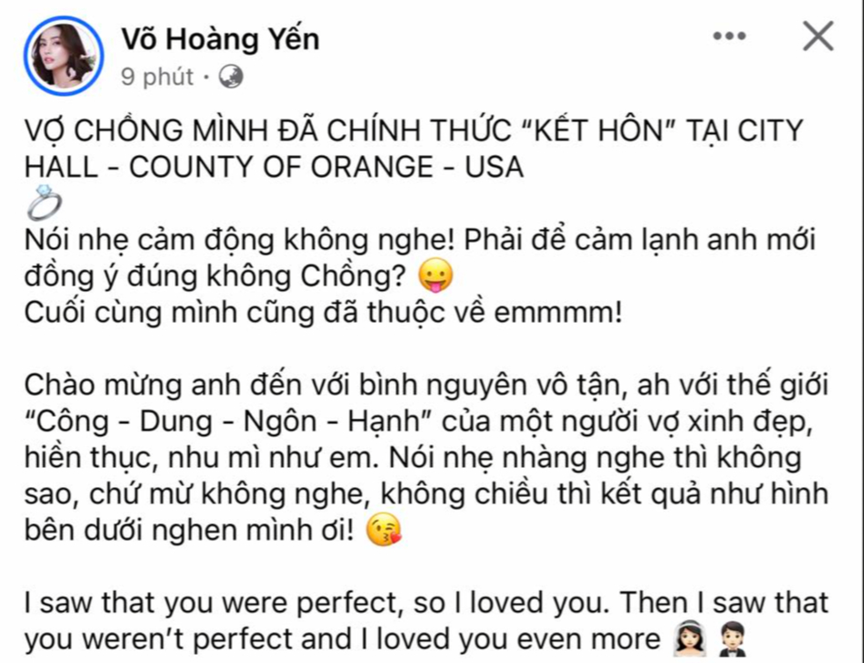 Võ Hoàng Yến chia sẻ: "Vợ chồng mình đã chính thức 'kết hôn' tại City Hall - County of Orange - Mỹ. Nói nhẹ cảm động không nghe! Phải để cảm lạnh anh mới đồng ý đúng không chồng? Cuối cùng mình cũng đã thuộc về emmm!".