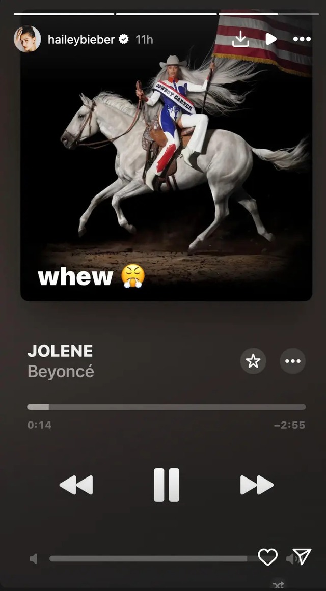 Theo nguồn tin, Hailey vừa đăng story thông báo cô đang lắng nghe ca khúc Jolene (Beyoncé) kèm icon gương mặt giận dữ. Đáng nói, ca từ bài hát là lời cảnh cáo không được đến gần chồng mình của chính thất dành cho tiểu tam. Từ đây, bà xã Justin bỗng bị tố đăng story dằn mặt Selena, đồng thời nhắn nhủ tình địch hãy tránh xa người bạn đời của mình. Còn nhớ Justin - Hailey kết hôn hồi năm 2018, chỉ 1 thời gian ngắn sau khi nam ca sĩ chia tay Selena. Kể từ đó đến nay, Hailey - Selena liên tục vướng tin đồn bất hòa, xem nhau như kẻ thù "không đội trời chung".