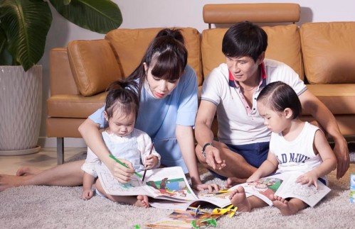 - Chúng tôi có một nguyên tắc là ai đang dạy con thì người kia không can thiệp vào. Ở nhà, tôi hay la rầy các bé, còn anh Hải có vẻ chiều con hơn. Cũng may, các bé được rèn giũa từ nhỏ nên ít khi vòi vĩnh, mè nheo bố mẹ.