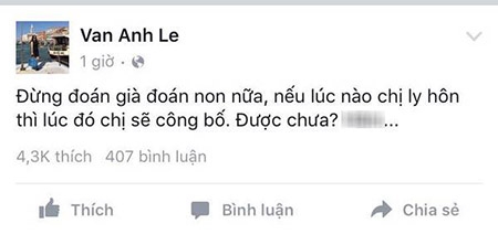 Cách đây ít giờ, vợ của vị đại gia này đã công khai trả lời trên facebook về vấn đề trên. Theo đó, chị nói rằng: "Đừng đoán già đoán non nữa. Nếu lúc nào ly hôn thì lúc đó chị sẽ công bố! Được chưa". Đoạn chia sẻ của chị đã gây sự chú ý của nhiều người bởi nó trả lời câu hỏi mà dư luận đang tò mò, quan tâm.