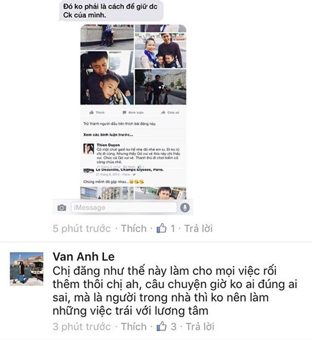 Tuy nhiên, chị Vân Anh - vợ của đại gia Chu Đăng Khoa cũng không ngần ngại comment lại trong post của chị chồng. Chị Vân Anh chất vấn rằng có phải có người tác động tới chị chồng khiến chị viết status này. Chị Vân Anh cũng nhắn nhủ: "Chị đăng như thế này làm cho mọi việc rối thêm thôi chị à, câu chuyện giờ không ai đúng ai sai, mà là người trong nhà thì không nên làm những việc trái với lương tâm".