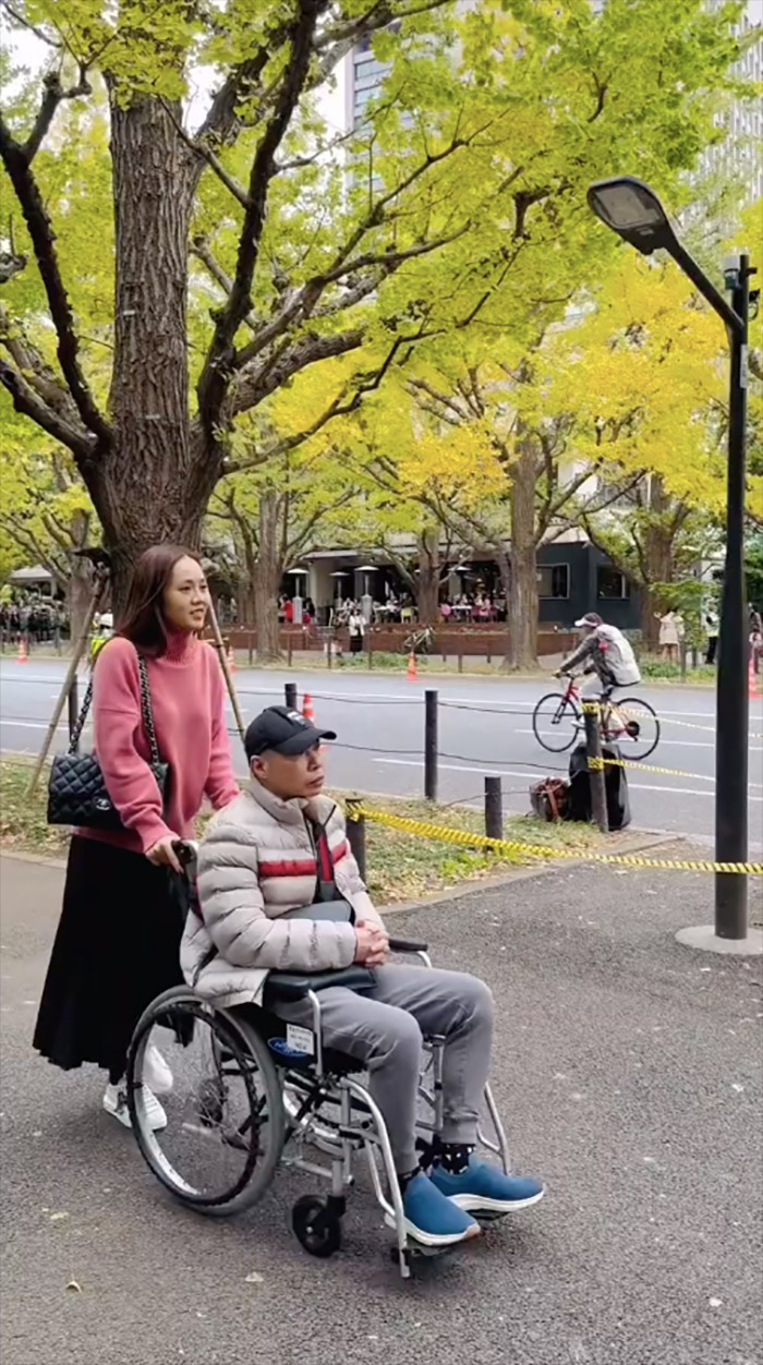 Thật ra anh Lý vẫn có thể đi bộ lại được, nhưng mà mình được biết là việc đi bộ ở Nhật Bản khá lâu và xa, để tránh cho mọi người phải chờ đợi thì hai vợ chồng quyết định dùng xe đẩy để tránh mất thời gian của mọi người...".