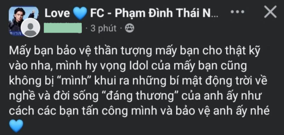 Bài đăng của S.H khiến cư dân mạng, đặc biệt là các fan của Phạm Đình Thái Ngân dậy sóng. Nhưng chưa kịp hết sốc thì người hâm mộ của nam ca sĩ tiếp tục xôn xao, bởi lẽ sau khi công khai tâm thư nghỉ việc, S.H được cho là đã vào group fan để đăng tải một status cực căng: "Mấy bạn bảo vệ thần tượng mấy bạn cho thật kỹ vào nha, mình hy vọng Idol của mấy bạn cũng không bị 'mình' khui ra những bí mật động trời về nghề và đời sống 'đáng thương' của anh ấy như cách các bạn tấn công mình và bảo vệ anh ấy nhé".