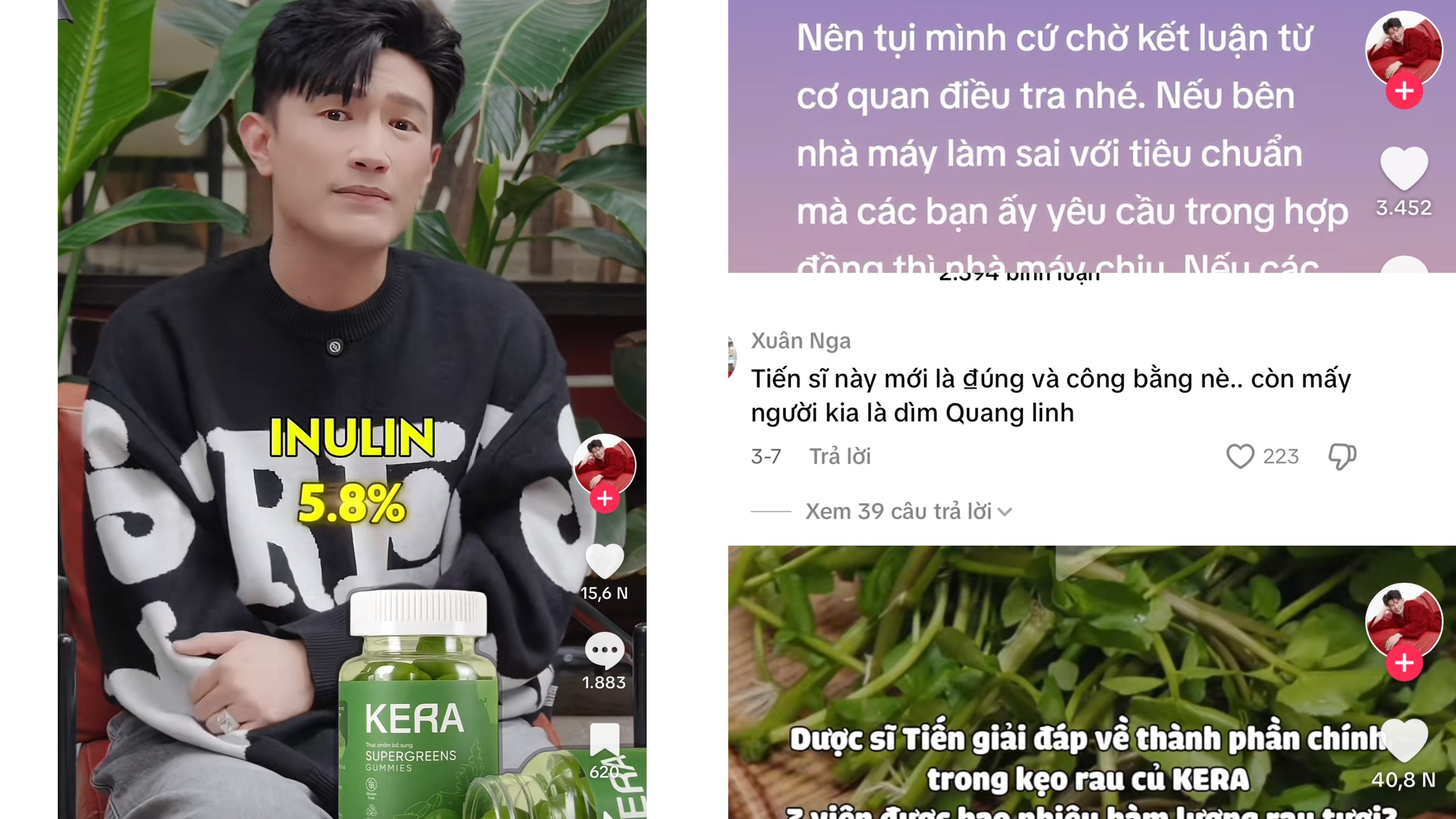 Trong các số video khác, người này nói hiện tượng tiêu chảy sau khi dùng kẹo Kera là do Inulin – một loại chất xơ hòa tan và cho rằng vấn đề chỉ nằm ở cách quảng cáo sai lệch của Công ty Chị Em Rọt (CER Group), chứ sản phẩm không có hại.
