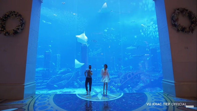 Tiếp đó, Ngọc Trinh và Vũ Khắc Tiệp thăm quan thủy cung trong khách sạn, một trong những thủy cung lớn nhất thế giới, nơi checkin của mọi hot vlogger quốc tế. Anh nói: "Thủy cung này là một thành phố cổ bị chìm dưới đáy biển, nó có 65000 loài vật dưới nước đang sinh sống".