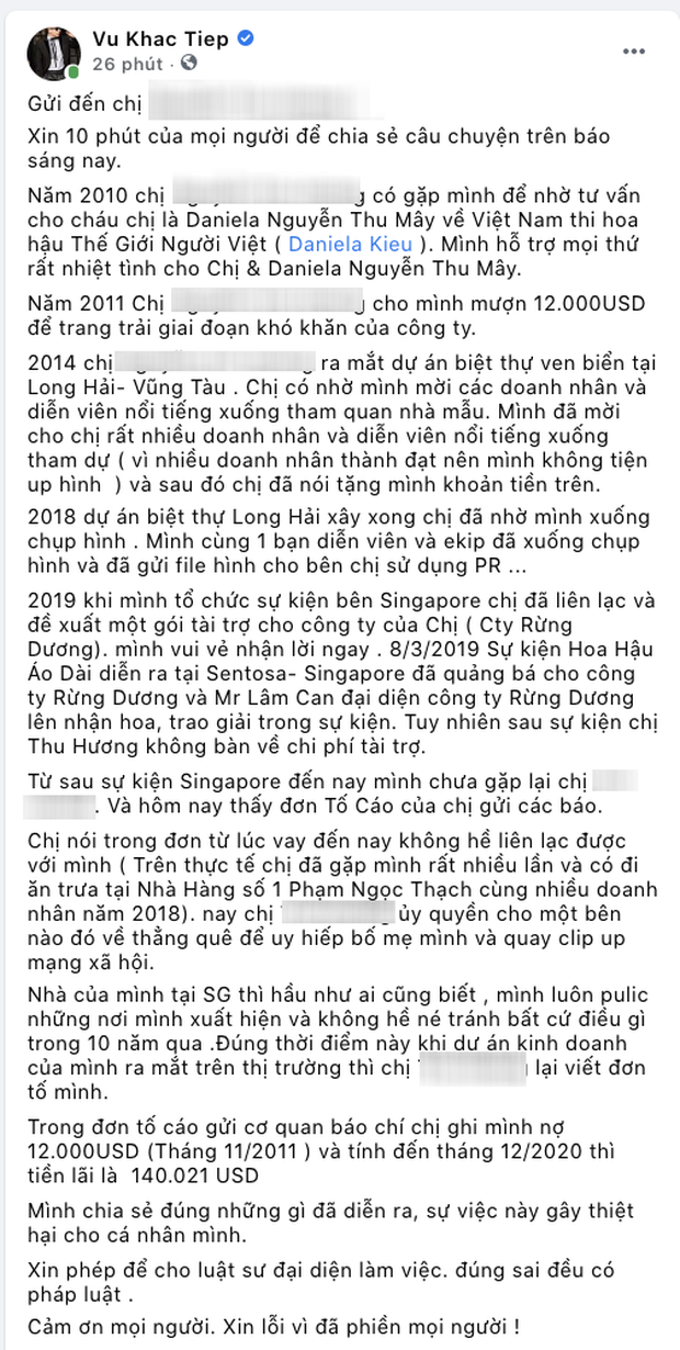 Cho đến chiều ngày 5/6, Vũ Khắc Tiệp đã chính thức lên tiếng trên trang cá nhân về sự việc này và gửi thẳng đến người đòi nợ anh - chị N.T.H. Anh cho biết sau khi mượn tiền nữ doanh nhân N.T.H vào năm 2011, đến năm 2014, nữ doanh nhân này đã nói tặng anh khoản tiền này. Sau đó, Vũ Khắc Tiệp cũng nhiều lần hỗ trợ cho N.T.H trong nhiều sự kiện cũng như cuộc sống đời thường. Anh khẳng định vẫn gặp cô rất thường xuyên chứ không có chuyện trốn tránh như lời đồn song đến giờ lại bị N.T.H gửi đơn tố cáo, thậm chí khẳng định bị nữ doanh nhân này điều người xuống quê nhà bố mẹ để uy hiếp và quay clip. Anh cũng quyết nhờ pháp luật can thiệp, đã cử luật sư giải quyết vụ việc này.