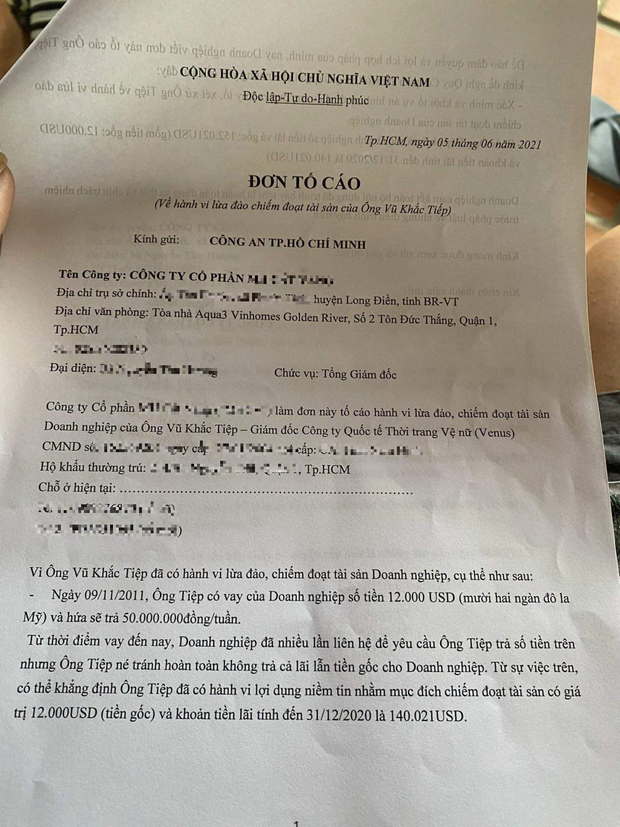 Suốt vài tiếng qua, MXH đang lan truyền nghi vấn có người đến nhà Vũ Khắc Tiệp để đòi nợ. Theo đó, người được ủy quyền đòi nợ đã cho biết gia đình "ông trùm Venus" có hành vi lừa đảo chiếm đoạt tài sản từ tháng 9/2011 với số tiền 12.000 USD (hơn 276 triệu đồng). Cho đến hiện tại, cả tiền lãi và tiền gốc đã lên đến con số 140.000 USD (hơn 3,2 tỷ đồng). Ngoài ra, người được uỷ quyền đòi nợ cũng khẳng định Vũ Khắc Tiệp hoàn toàn né tránh gặp mặt dù nhiều lần được liên lạc để yêu cầu trả tiền.