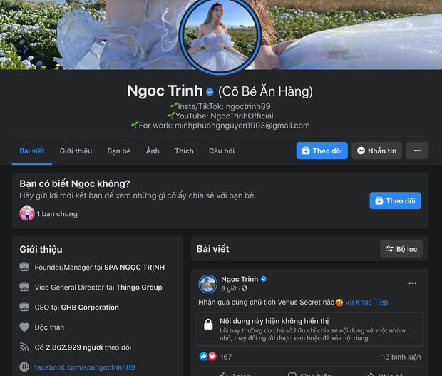 Ngọc Trinh là một trong những cái tên gây chú ý nhất nhì showbiz Việt. Từ đời sống đến công việc, lối chi tiền mạnh tay, siêu xe hạng sang, biệt thự tiền tỷ của Ngọc Trinh đều nhanh chóng thu hút dư luận. Đó là lý do "nữ hoàng nội y" sở hữu một lượng người theo dõi khổng lồ trên các nền tảng mạng xã hội như Instagram, TikTok, Facebook, YouTube...