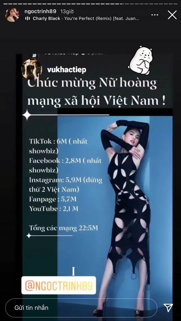Mới đây, nhân dịp Ngọc Trinh chính thức đạt mốc 6 triệu người theo dõi trên TikTok, Vũ Khắc Tiệp cũng đã nhanh chóng có động thái chúc mừng "đàn em". Trên story cá nhân của mình, Vũ Khắc Tiệp đã thống kê lại toàn bộ những mạng xã hội của Ngọc Trinh với những chỉ số cao nhất kèm với chú thích bên cạnh.