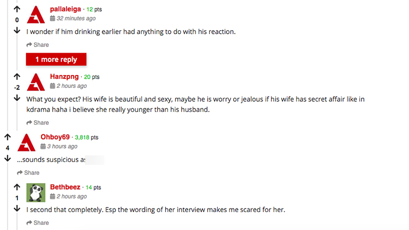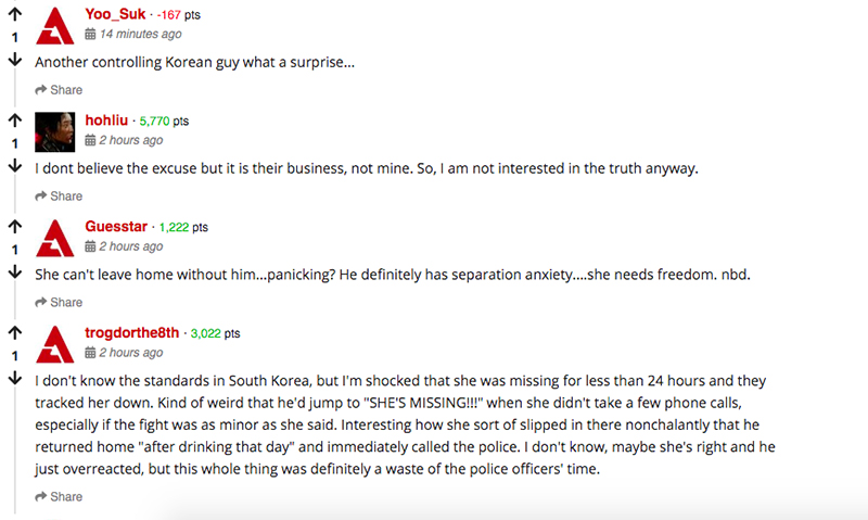Theo netizen, câu chuyện của cặp vợ chồng minh tinh này khá đáng ngờ. Theo lời kể của chính Kim Seung Woo và Kim Nam Joo, nữ diễn viên chỉ mất liên lạc một lúc vì phải đi gặp bạn và điện thoại sập nguồn, tuy nhiên cảnh sát chỉ thật sự vào cuộc khi đối tượng bị mất tích quá 24 tiếng đồng hồ.
