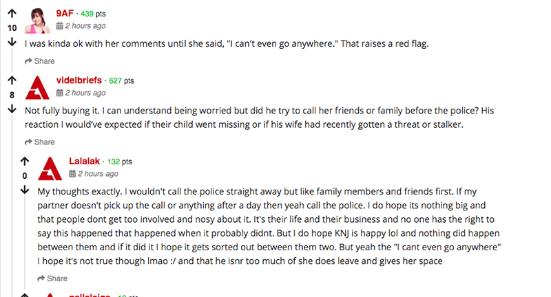 Ngoài ra, theo netizen, phản ứng bình thường của một người sau khi phát hiện người thân của họ mất tích sẽ là gọi điện thoại cho bạn bè, đồng nghiệp của người thân đó trước khi nghĩ đến việc trình báo cảnh sát. Tuy nhiên tài tử Kim lại không hề gọi điện cho những người bạn thân thiết của vợ, những người đang gặp gỡ cô vào ngày hôm đó, để kiểm tra lại thông tin. 2 dữ kiện này không khỏi khiến công chúng nghi ngờ rằng cặp đôi thật sự có vấn đề khác đằng sau nhưng cố gắng lấp liếm.