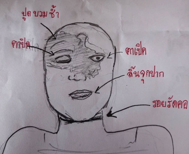 Theo hình ảnh phác họa được chia sẻ có thể thấy, một bên mặt của nữ diễn viên "Chiếc Lá Cuốn Bay" bị phồng nghiêm trọng. Hai mắt của Tangmo cũng không bằng nhau, khá bất thường. Một bên nhắm chặt sưng phồng. Bên còn lại thì trợn tròn. Vị trí răng và lưỡi trông cũng không được bình thường. Thậm chí, ở phần cổ của thi thể còn xuất hiện vết đỏ dài giống như bị siết.