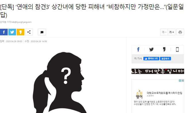 Theo thông tin độc quyền đăng tải trên tờ Sports Kyunghyang, một nữ diễn viên được gọi là A nổi tiếng với hình ảnh trong sáng, dịu dàng vừa bị tố là tiểu tam, ngoại tình với anh rể - một bác sĩ 44 tuổi. Theo tờ Sports Kyunghyang chia sẻ, nữ diễn viên A này xuất hiện trong chương trình “Love Naggers 3” của kênh KBS Joy.