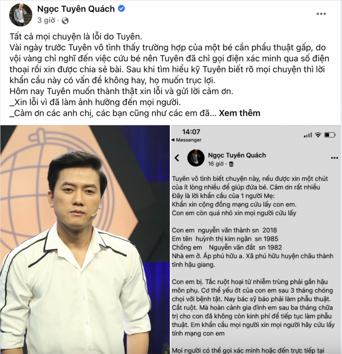 Mọi việc bắt nguồn từ khi Quách Ngọc Tuyên đọc được tin 1 gia đình đang túng thiếu tiền để phẩu thuật cho con bị tắc ruột, hoại tử,... Sau khi biết về hoàn cảnh này, nam diễn viên đã chủ động liên hệ theo số điện thoại có sẵn để xác minh. Ngày 28/2, Quách Ngọc Tuyên đã chia sẻ lại bài viết của người mẹ để góp phần kêu gọi nhiều người giúp đỡ. Lúc này, Khả Như và Lê Dương Bảo Lâm cũng có hành động kêu gọi quyên góp giống như Quách Ngọc Tuyên.
