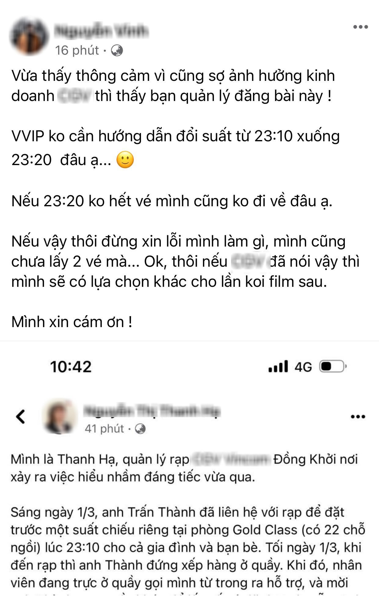 Trên trang cá nhân, N.V cũng chia sẻ lại bài đăng của quản lý rạp phim và thể hiện rõ sự thất vọng: "Vừa thấy thông cảm vì cũng sợ ảnh hưởng kinh doanh của rạp thì thấy bạn quản lý đăng bài này. VVIP không cần hướng dẫn đổi suất từ 23h10 xuống 23h20 đâu ạ. Nếu 23h20 không hết vé mình cũng không đi về đâu ạ.