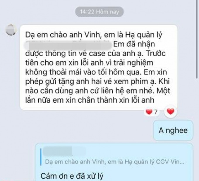 Trao đổi với Zing về vấn đề này, N.V cho biết: "Tôi cũng đề nghị mua vé suất 23h20 nhưng nhân viên nói đã hết vé. Tôi khẳng định nếu có vé tôi đã không đi về. Rạp phim phản hồi như vậy thành ra tôi khó khăn có 10 phút. Nhưng tôi đâu hẹp hòi gì 10 phút. Tôi cũng có thẻ VVIP, chứng tỏ đã xem rất nhiều phim ở đó nên đâu cần phải hướng dẫn gì. Tôi yêu thích bộ phim và bất công đến mà không xem được nên mới không hài lòng và lên bài. Công việc của tôi cũng không cần sự nổi tiếng để câu tương tác hay làm rùm beng".